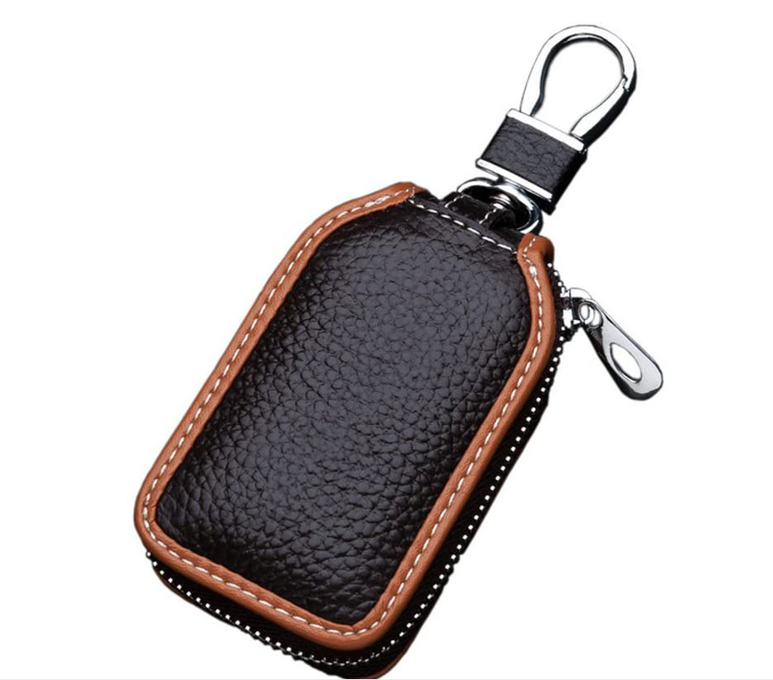 Car Key Case Superior Genuine Leather Auto Key FOB Holder Smart KeyChain Protector Cover with Metal Hook and Zipper.