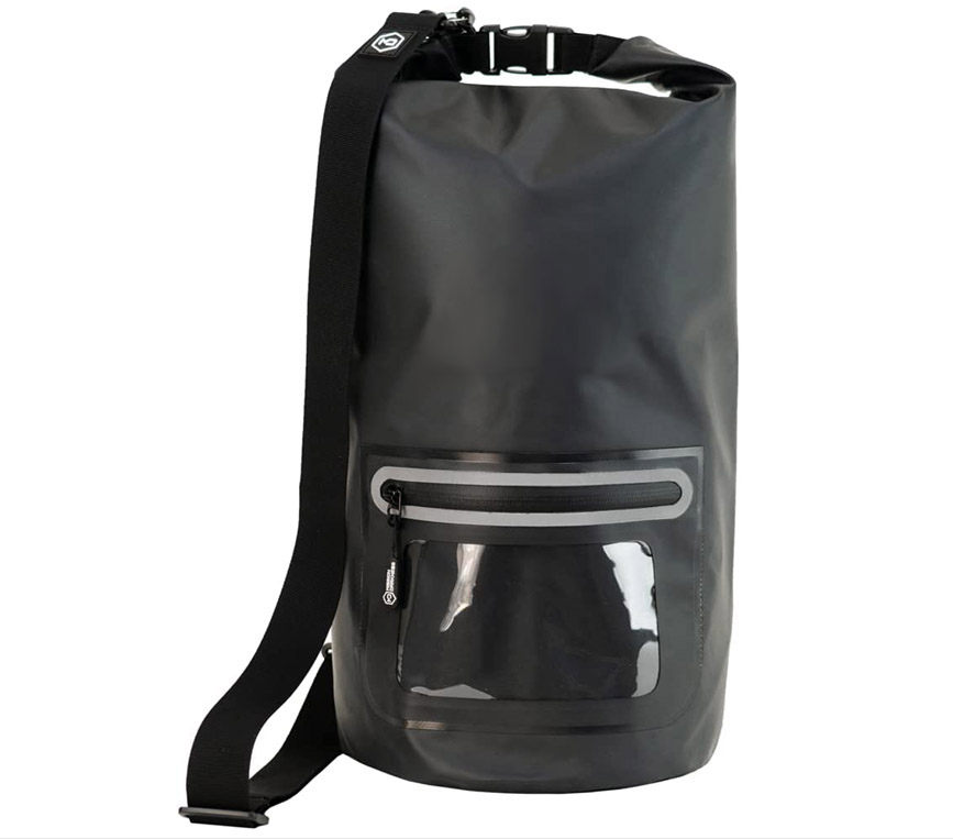 Extremely durable dry bag with an adjustable and detachable shoulder strap (tote bag style), transparent front zipper pocket, and roll-down and clip shut closure.
