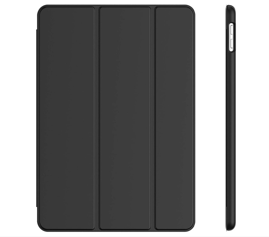 Magnetic smart cover supports automatic sleep/wake function. The tri-fold front cover can support iPad in two standing position for viewing and typing