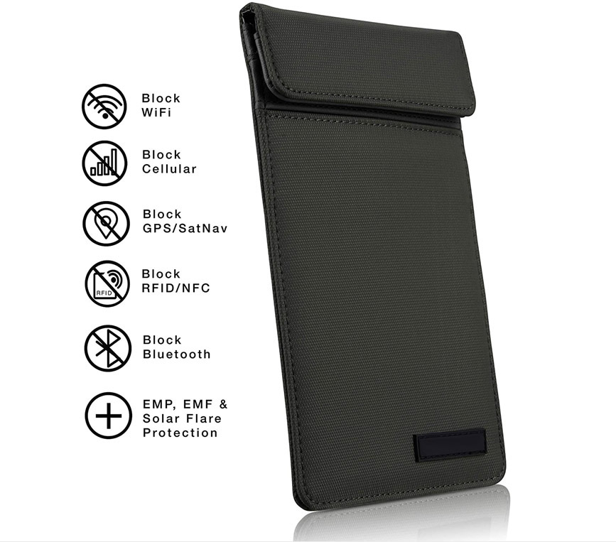 Protect yourself from hacking, tracking, data extraction/wiping. 100% Signal Blocking Faraday Cage Technology shields against RFID, WIFI, Bluetooth, NFC, EMP, Solar Flare, Cellular, GPS, Radio - every signal type! Also provides EMF protection against the long term effects of EMF Radiation.