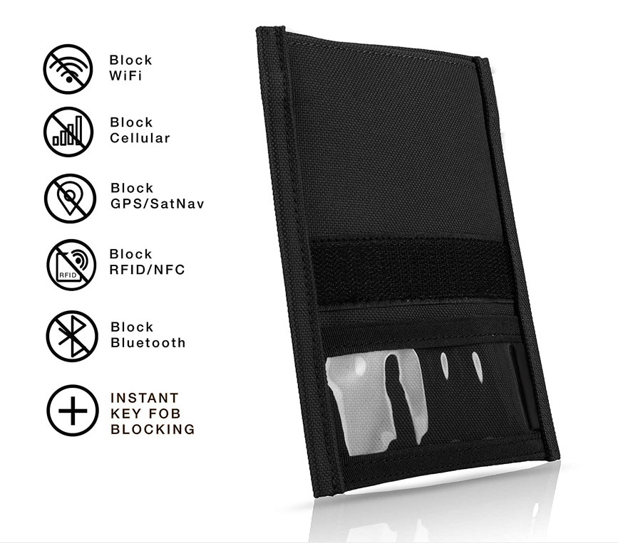 100% Signal Blocking Faraday Cage Technology. This Faraday bag is the perfect RFID Blocker. Our technology shields against RFID, WIFI, Bluetooth, NFC, EMP, Solar Flare, Cellular, GPS, Radio.