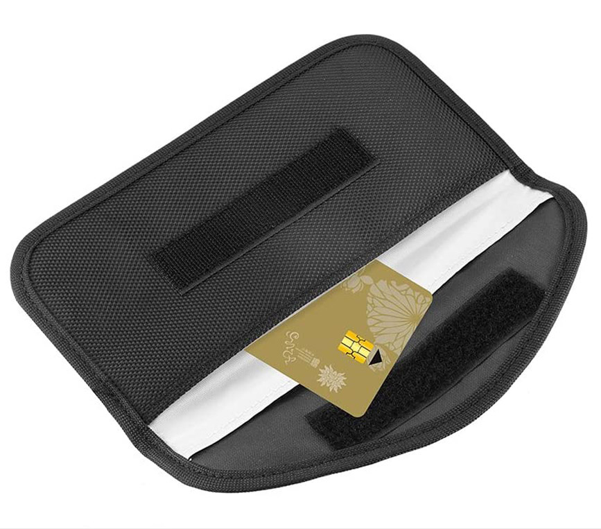 The faraday bag protects chip technology "smart-cards" from hackers' RFID readers in the range of 10 kHz-30 GHz.